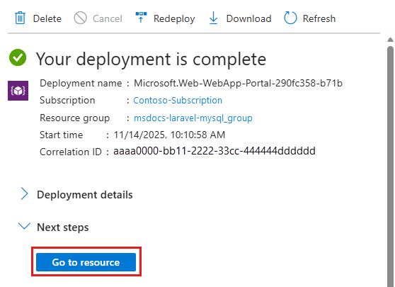 2. In Resource Group, select msdocs-laravel-mysql_group.