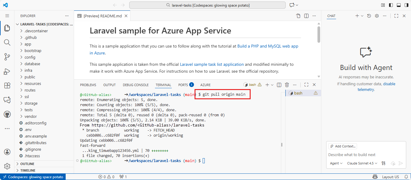 1. Select Code > Create codespace on main. The codespace takes a few minutes to set up. Also, the provided .env file already contains a dummy APP_KEY variable that Laravel needs to run locally.