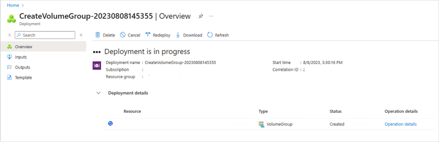 The Volume Groups deployment workflow starts, and the progress is displayed. This process can take a few minutes to complete.