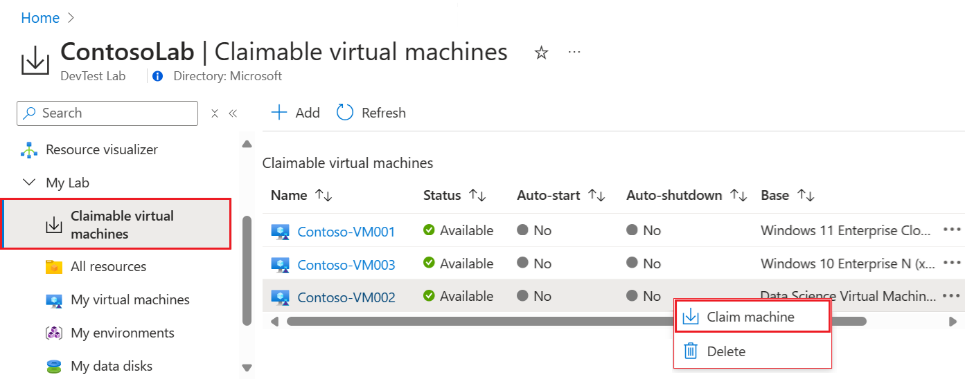 1. On the lab Overview page, expand the My lab section on the left menu, and select Claimable virtual machines.