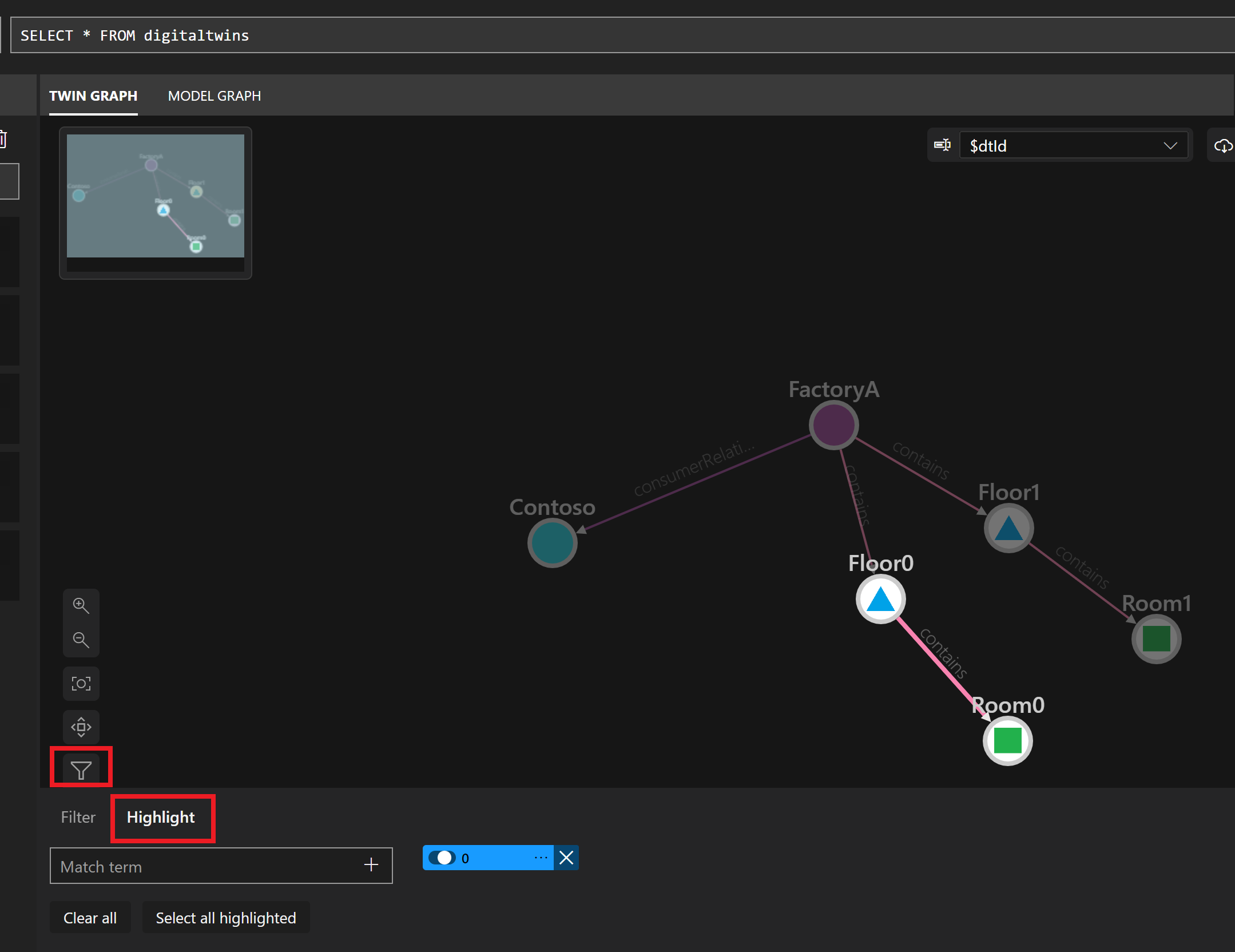Run a query using the Query Explorer to see the twins and relationships in the query result displayed in the Twin Graph panel.