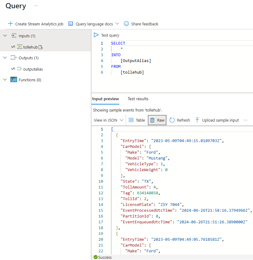 Your Stream Analytics job is now created where your query is the same that you tested, and input is your event hub.