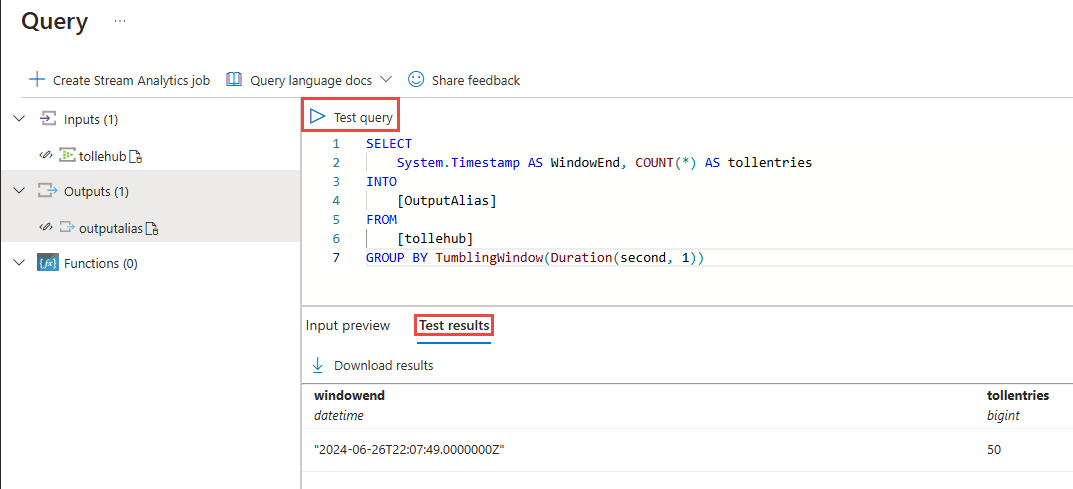 - Test your query – Prepare a transformation query and test it directly in the Azure portal. For the query language syntax, see Stream Analytics Query Language documentation.