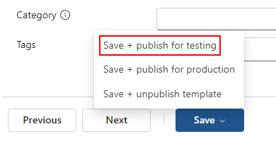 On the Summary tab or a preceding tab, at the tab bottom, from the Save list, select Save + publish for testing.