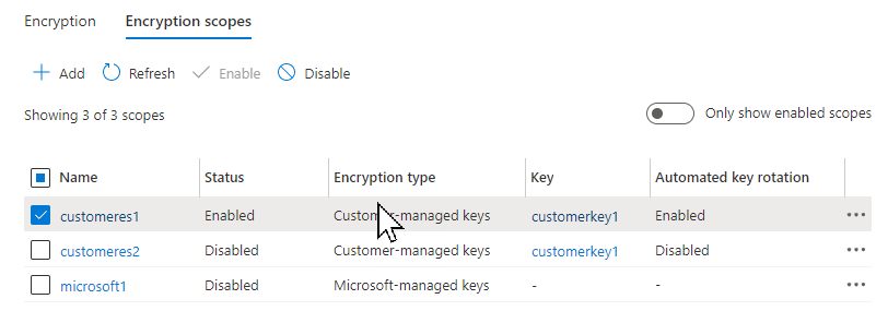 To view the encryption scopes for a storage account in the Azure portal, navigate to the Encryption Scopes setting for the storage account. From this pane, you can enable or disable an encryption scope or change the key for an encryption scope.