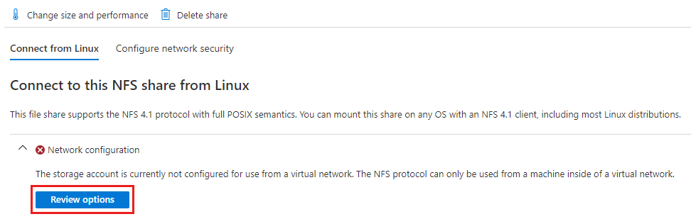 1. Select the NFS file share you created. You should see a dialog that says Connect to this NFS share from Linux. Under Network configuration, select Review options
