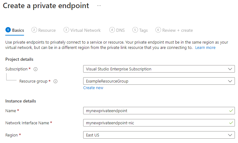 4. Leave Subscription and Resource group the same. Under Instance, provide a name and select a region for the new private endpoint. Your private endpoint must be in the same region as your virtual network, so use the same region as you specified when creating the VM. When all the fields are complete, select Next: Resource.