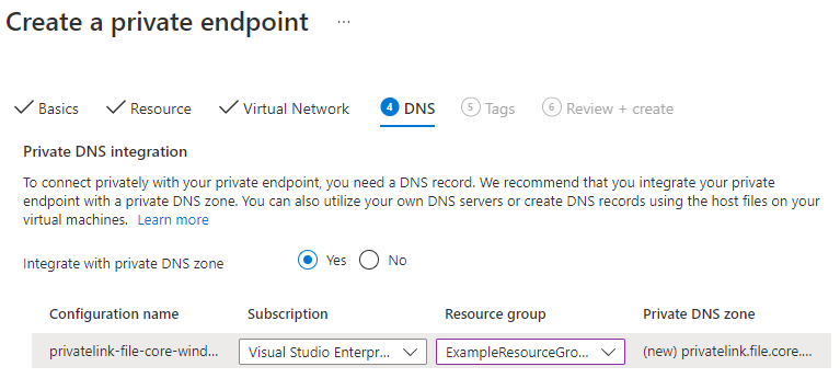 7. Select Yes for Integrate with private DNS zone. Make sure the correct subscription and resource group are selected, and then select Next: Tags.