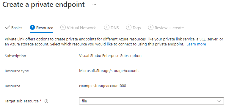 5. Confirm that the Subscription, Resource type and Resource are correct, and select File from the Target sub-resource drop-down. Then select Next: Virtual Network.