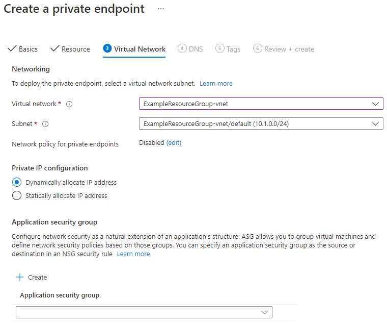 6. Under Networking, select the virtual network associated with your VM and leave the default subnet. Under Private IP configuration, leave Dynamically allocate IP address selected. Select Next: DNS.
