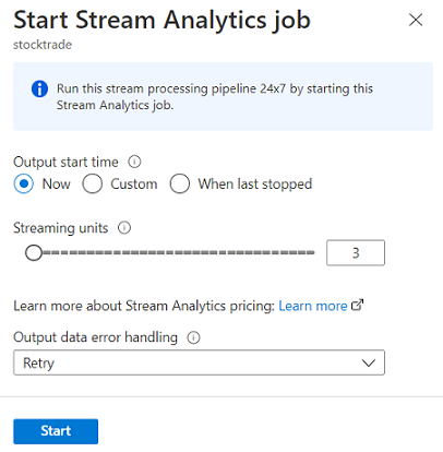 - Output data error handling: Policies for output data error handling apply only when the output event produced by a Stream Analytics job doesn't conform to the schema of the target sink. You can configure the policy by choosing either Retry or Drop. For more information, see Azure Stream Analytics output error policy.