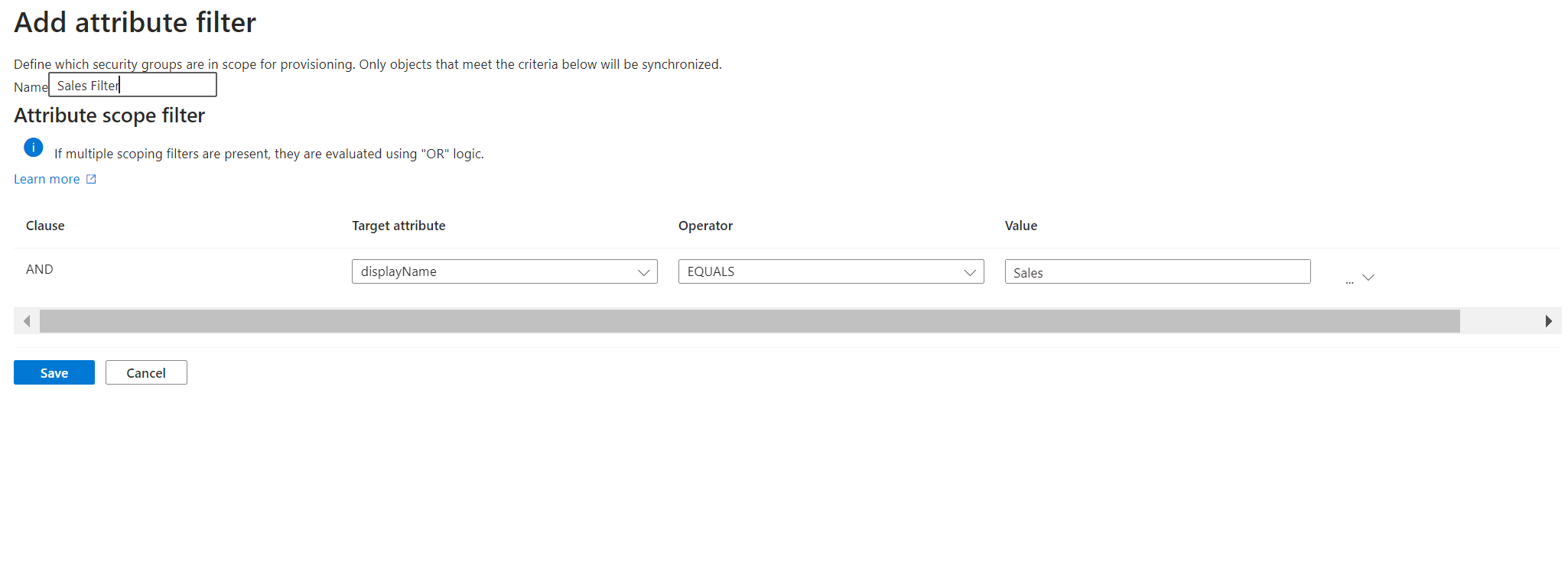 Finally, multiple scoping filters can be created for a group. If multiple scoping filters are present, they're evaluated together by using "OR" logic. The "OR" logic means that if either of the clauses in any of the configured scoping filters evaluate to "true", the group is provisioned.