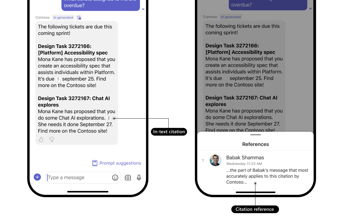 - AI label, citation, feedback buttons, and sensitivity label are available for bots in personal chats, group chats, and channels.