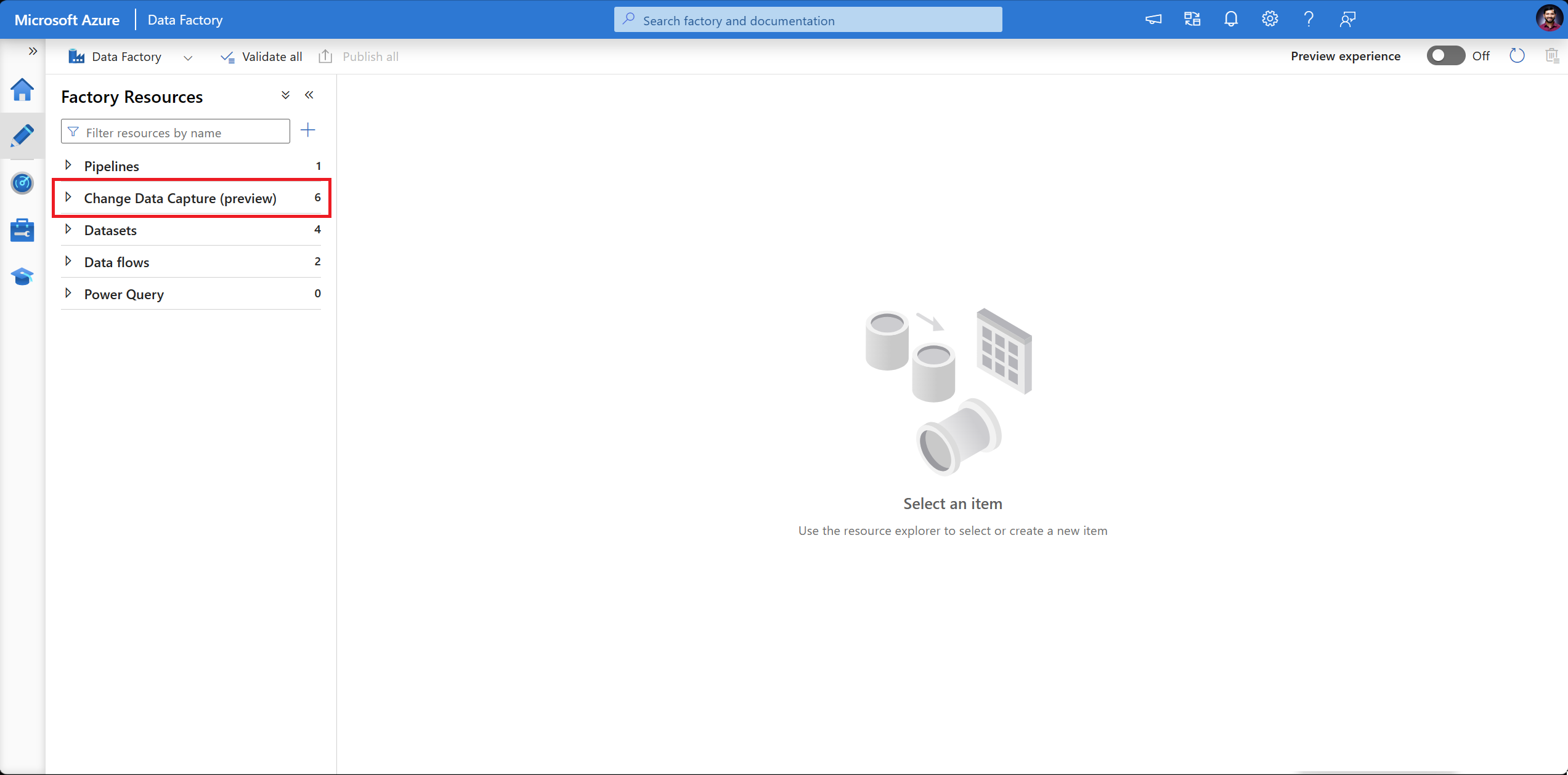 Go to the Author pane in your data factory. Below Pipelines, a new top-level artifact called Change Data Capture (preview) appears.