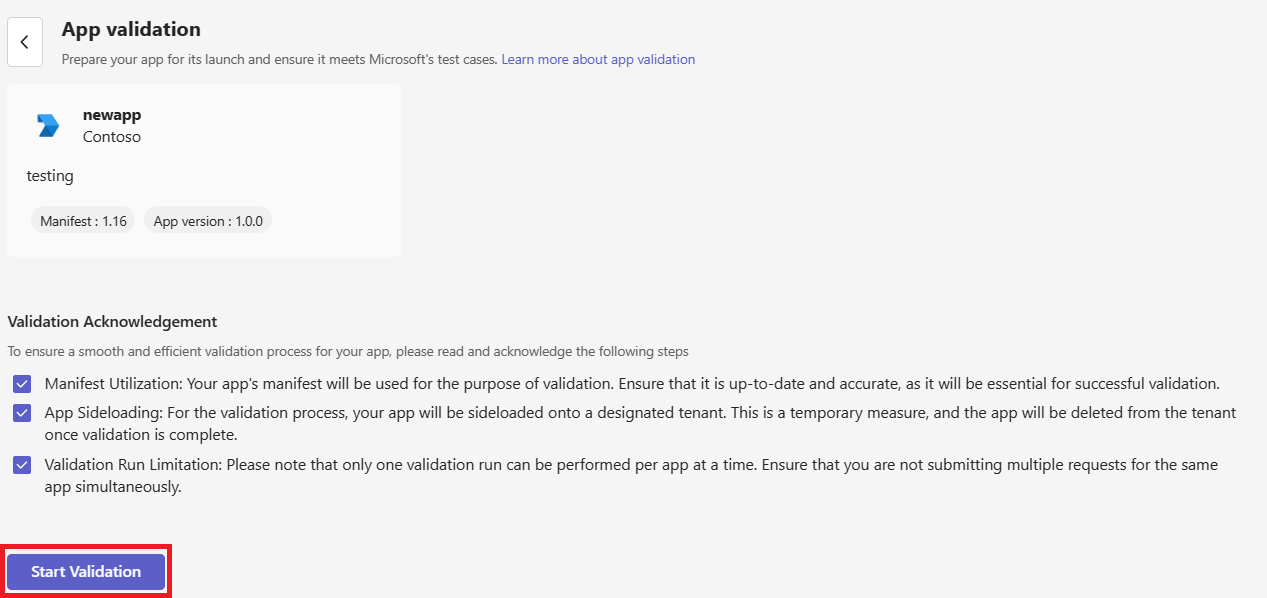 - You can submit only one validation request for a particular app at any given time. After the current validation completes, you can initiate a subsequent request.