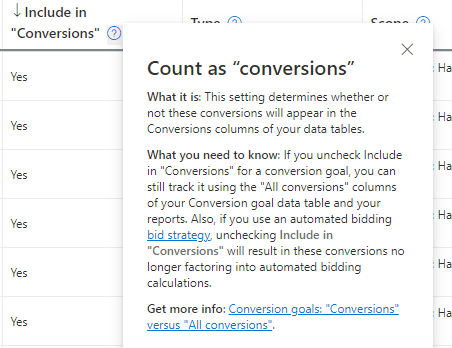 What you need to know: If you uncheck Include in "Conversions" for a conversion goal, you can still track it using the "All conversions" columns of your Conversion goal data table and your reports. Also, if you use an automated bidding bid strategy, unchecking Include in "Conversions" will result in these conversions no longer factoring into automated bidding calculations.