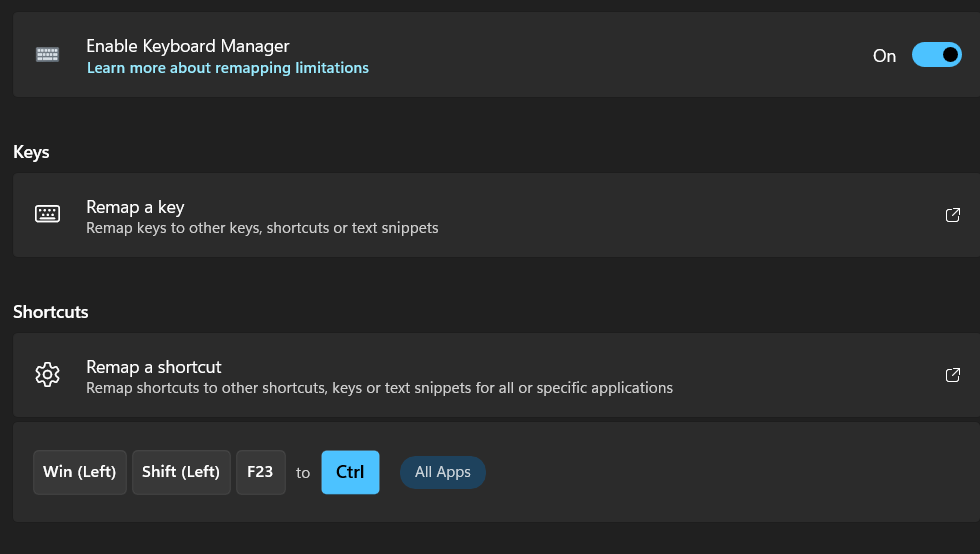 2. Open the PowerToys tool and select the "Keyboard Manager" tab.