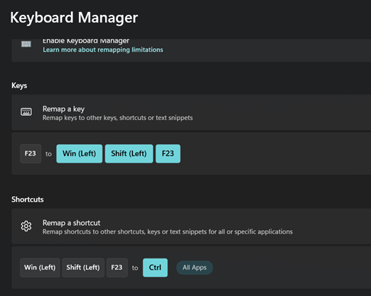 2. use Remap a shortcut: to map Win (Left) Shift (Left) F23 to Ctrl (or whatever you want it to be)