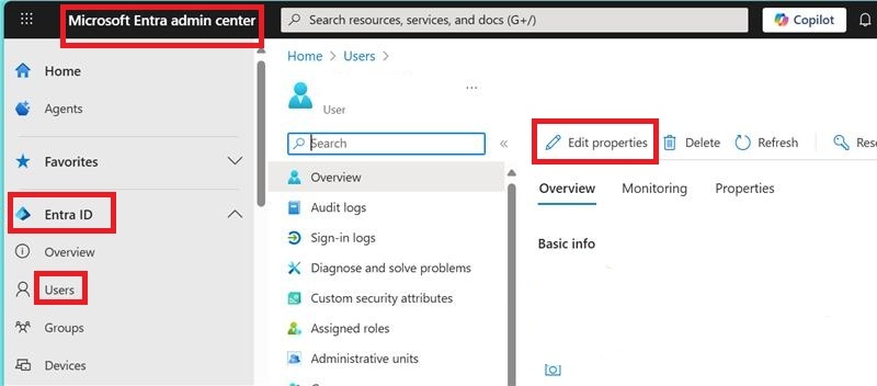 - Sign in to https://entra.microsoft.com with User Administrator or Global Administrator privileges.