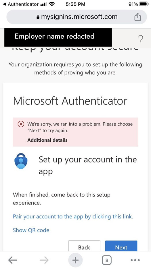 Here are three screenshots. The first shows the set up error I receive every time. (My employer's name has been redacted for privacy.)