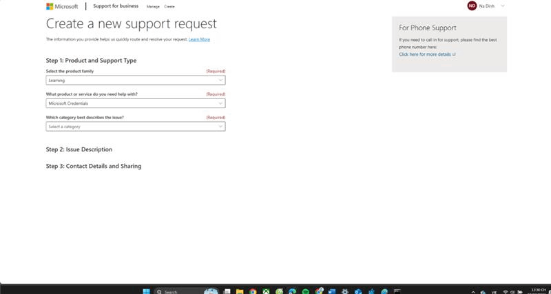 - Click into https://aka.ms/credentialssupport)again. At this step the page will auto-fill Product Family (learning) and service (Microsoft Credential) for you.