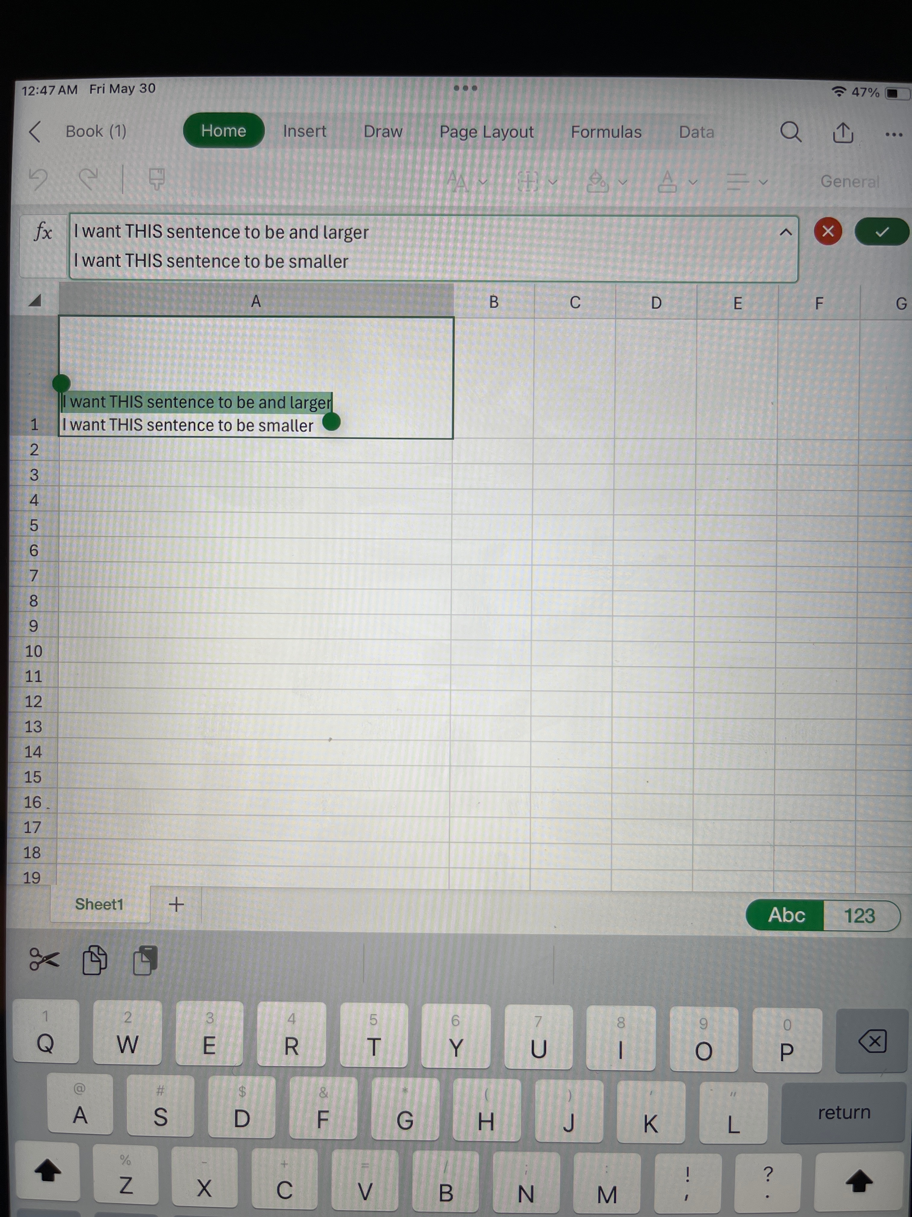Thank you for posting this issue on community forum. Excel on iPad works differently than the desktop version, and unfortunately, formatting text within individual parts of a single cell isn't supported on iPad. When you select text inside a cell, Excel treats the entire cell as a unit, so any formatting applies to the whole cell, not just selected words. A workaround would be to use separate cells for differently formatted text or to create a design using merged cells and different font styles. Another option is to format your schedule in Word or PowerPoint, where text styling within a section is more flexible, and then insert it into Excel as an image if needed. If you're working on a desktop version of Excel, formatting individual parts of text within a cell is possible using the format toolbar.