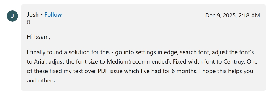 How to fix disappearing some of my text that I wrote or added on a PDF before? (It occurs on the latest version of Microsoft Edge browser) And then I have to click on the text so that I can see the rest of the text that I wrote before. I've attached two images to illustrate what I said. problem. Additionally, I don't want to enable New PDF Viewer in edge://flags to solve this problem because this pdf viewer reduces the quality of document and speed of working on that. Thanks for following up on this problem. Screenshot 2025-12-08 082346