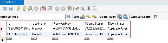 [Click the following image to expand it. ] Screenshot of a s p net users table, with entries displaying I D, User Name, Password Hash, Security Stamp, and Discriminator columns.