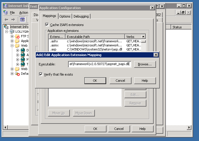 6. Paste the path to the aspnet_isapi.dll into the Executable field (you can copy this path from the script map for .aspx files)