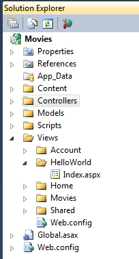 After you click Add, a new folder and a new file will appear in the Solution Folder, as seen here. I now have a HelloWorld folder under Views, and an Index.aspx file inside that folder.