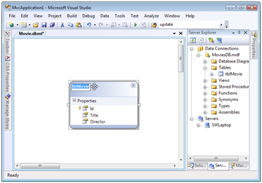 Immediately after you create the Movie LINQ to SQL Classes, the Object Relational Designer appears. You can drag database tables from the Server Explorer window onto the Object Relational Designer to create LINQ to SQL Classes that represent particular database tables. We need to add the tblMovie database table onto the Object Relational Designer (see Figure 4).