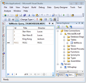 In this tutorial, we build a basic Movie database application. We start by creating the Movie database application in the fastest and easiest way possible. We perform all of our data access directly from our controller actions.