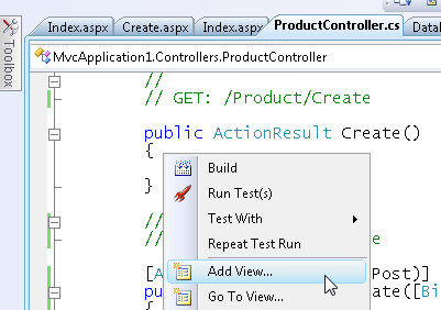 - Right-click the Create() action in the Product controller and select the menu option Add View (see Figure 1).