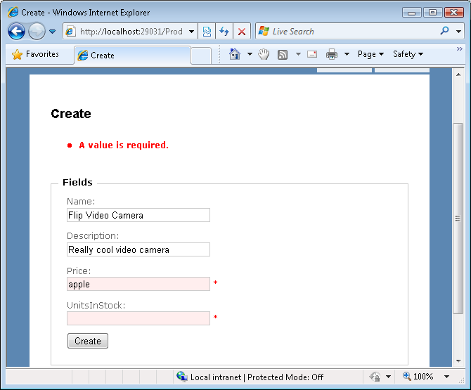 If you submit the HTML form for creating a Product, and you enter an invalid value for the price field and no value for the UnitsInStock field, then you'll get the validation messages displayed in Figure 4. Where do these validation error messages come from?