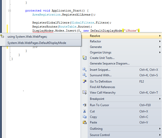 In the code, right-click DefaultDisplayMode, choose Resolve, and then choose using System.Web.WebPages;. This adds a reference to the System.Web.WebPages namespace, which is where the DisplayModes and DefaultDisplayMode types are defined.