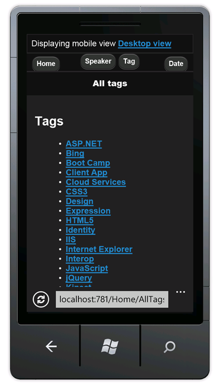 Press CTRL+F5 to run the application, which will display it in your desktop browser. Start your mobile browser emulator, copy the URL for the conference application into the emulator, and then click the Browse by tag link. If you are using the Windows Phone Emulator, click in the URL bar and press the Pause key to get keyboard access. The image below shows the AllTags view (from choosing Browse by tag).