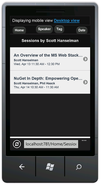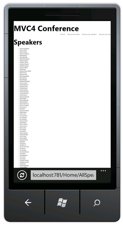 In the mobile browser, select the Speakers link. Because there's no mobile view(AllSpeakers.Mobile.cshtml), the default speakers display (AllSpeakers.cshtml) is rendered using the mobile layout view (_Layout.Mobile.cshtml).
