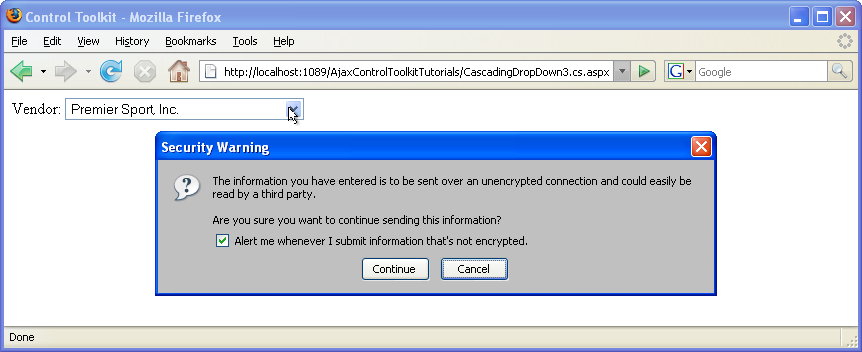 Loading the page in the browser will fill the dropdown list with three vendors, the second one being preselected. Also, ASP.NET defines the __doPostBack() JavaScript method. Once the page has been loaded, this JavaScript call is added to the dropdown list, but only if there are elements in it. If there are no elements in the list, the Control Toolkit is currently loading them, so the JavaScript code uses a timeout and tries again in a half second.
