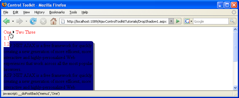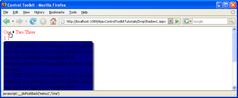The DropShadow control in the AJAX Control Toolkit extends a panel with a drop shadow. However this shadow sometimes conflicts with other controls, for instance the ASP.NET Menu control. When a menu entry pops up, it appears behind the drop shadow.