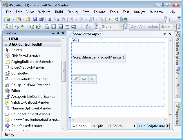 2. Add a ScriptManager control to the page by dragging the control onto the page from beneath the AJAX Extensions tab.