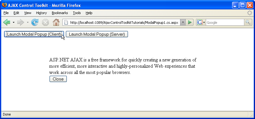 The job of launchModal() is to display the ModalPopup. The launchModal() function is executed once the complete HTML page has been loaded. At that moment, however, the ASP.NET AJAX framework has not been fully loaded yet. Therefore, the launchModal() function just sets a variable that the ModalPopup control must be shown later on: