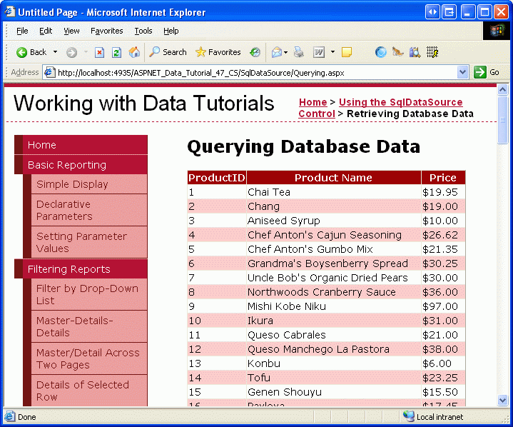 Visit this page through a browser. As Figure 11 shows, the GridView lists each product s ProductID, ProductName, and UnitPrice values.