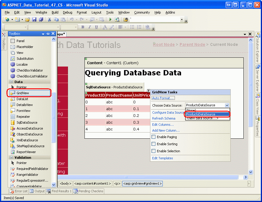Once the SqlDataSource has been configured, it can be bound to a data Web control, such as a GridView or DetailsView. For this tutorial, let s display the data in a GridView. From the Toolbox, drag a GridView onto the page and bind it to the ProductsDataSource SqlDataSource by choosing the data source from the drop-down list in the GridView s smart tag.