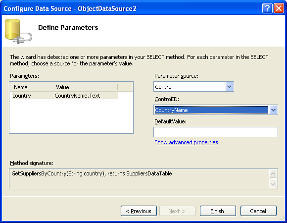Since the GetSuppliersByCountry(country) method has an input parameter, the wizard once again includes a final screen for choosing the parameter value. This time, set the Parameter source to Control. This will populate the ControlID drop-down list with the names of the controls on the page; select the CountryName control from the list. When the page is first visited the CountryName TextBox will be blank, so no results are returned and nothing is displayed. If you want to display some results by default, set the DefaultValue textbox accordingly.