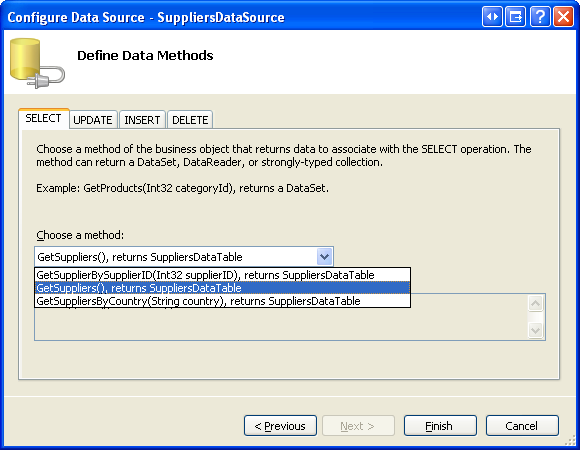 Figure 6: Configure the Data Source to use the SuppliersBLL Class's GetSuppliers() Method (Click to view full-size image)