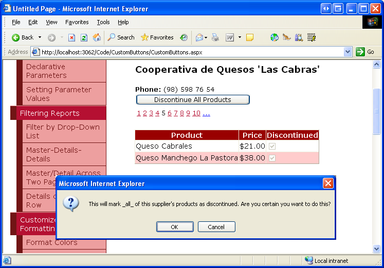 Imagine that Cooperativa de Quesos 'Las Cabras' has gone out of business and therefore its products are to be discontinued. Click the Discontinue All Products Button. This will display the client-side confirm dialog box (see Figure 16).