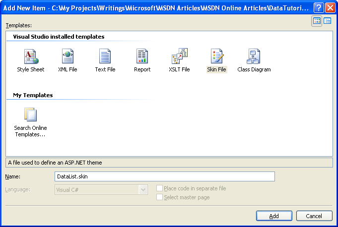 To add a Skin file, right-click on the App_Themes/DataWebControls folder, choose Add a New Item, and select the Skin File option from the list. Name the file DataList.skin.