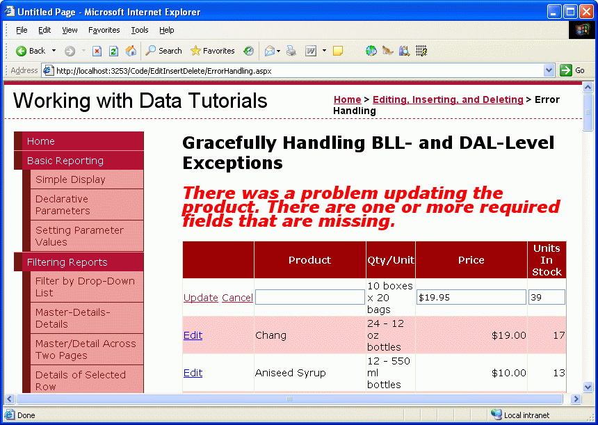 Figures 9 and 10 show a graceful way to handle exceptions raised due to invalid user input. Ideally, though, such invalid input will never reach the Business Logic Layer in the first place, as the ASP.NET page should ensure that the user's inputs are valid before invoking the ProductsBLL class's UpdateProduct method. In our next tutorial we'll see how to add validation controls to the editing and inserting interfaces to ensure that the data submitted to the Business Logic Layer conforms to the business rules. The validation controls not only prevent the invocation of the UpdateProduct method until the user-supplied data is valid, but also provide a more informative user experience for identifying data entry problems.