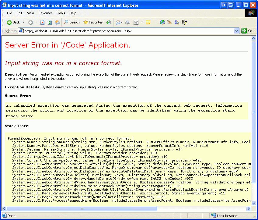 The FormatException is raised when the ObjectDataSource attempts to read in the original UnitPrice value. Since the ItemTemplate has the UnitPrice formatted as a currency (<%# Bind("UnitPrice", "{0:C}") %>), it includes a currency symbol, like $19.95. The FormatException occurs as the ObjectDataSource attempts to convert this string into a decimal. To circumvent this problem, we have a number of options: