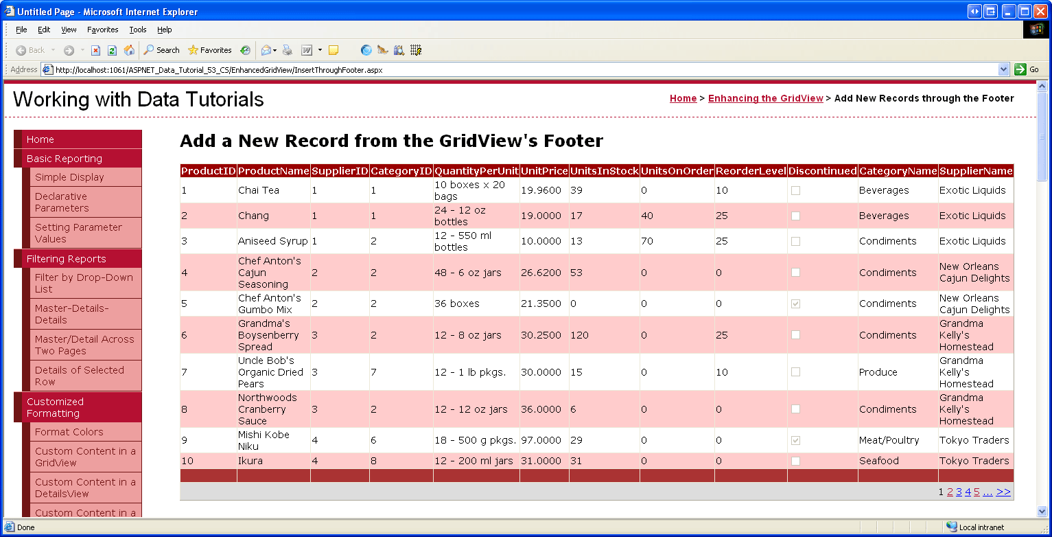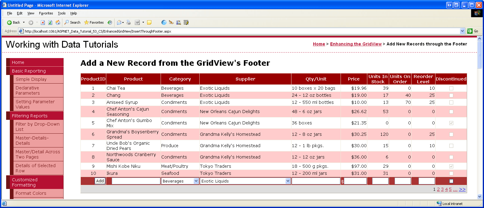 When viewed through a browser, the GridView s footer row now includes the completed inserting interface (see Figure 10). At this point, the inserting interface doesn t include a means for the user to indicate that she s entered the data for the new product and wants to insert a new record into the database. Also, we ve yet to address how the data entered into the footer will translate into a new record in the Products database. In Step 4 we'll look at how to include an Add button to the inserting interface and how to execute code on postback when it s clicked. Step 5 shows how to insert a new record using the data from the footer.